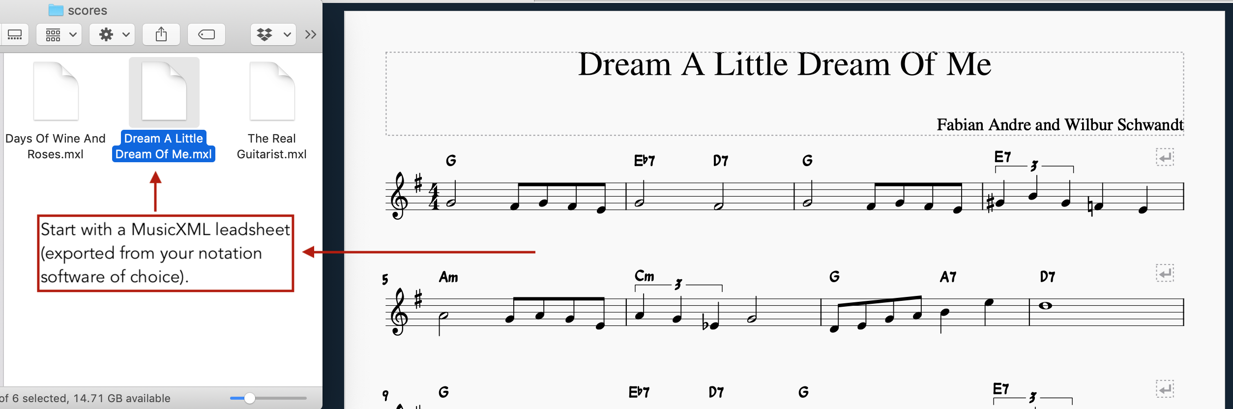 Start with a leadsheet (melody + chord symbols) in Compressed MusicXML format (.mxl file extension).
